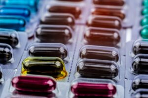 Closeup of vitamin and supplement capsules pill in blister pack.